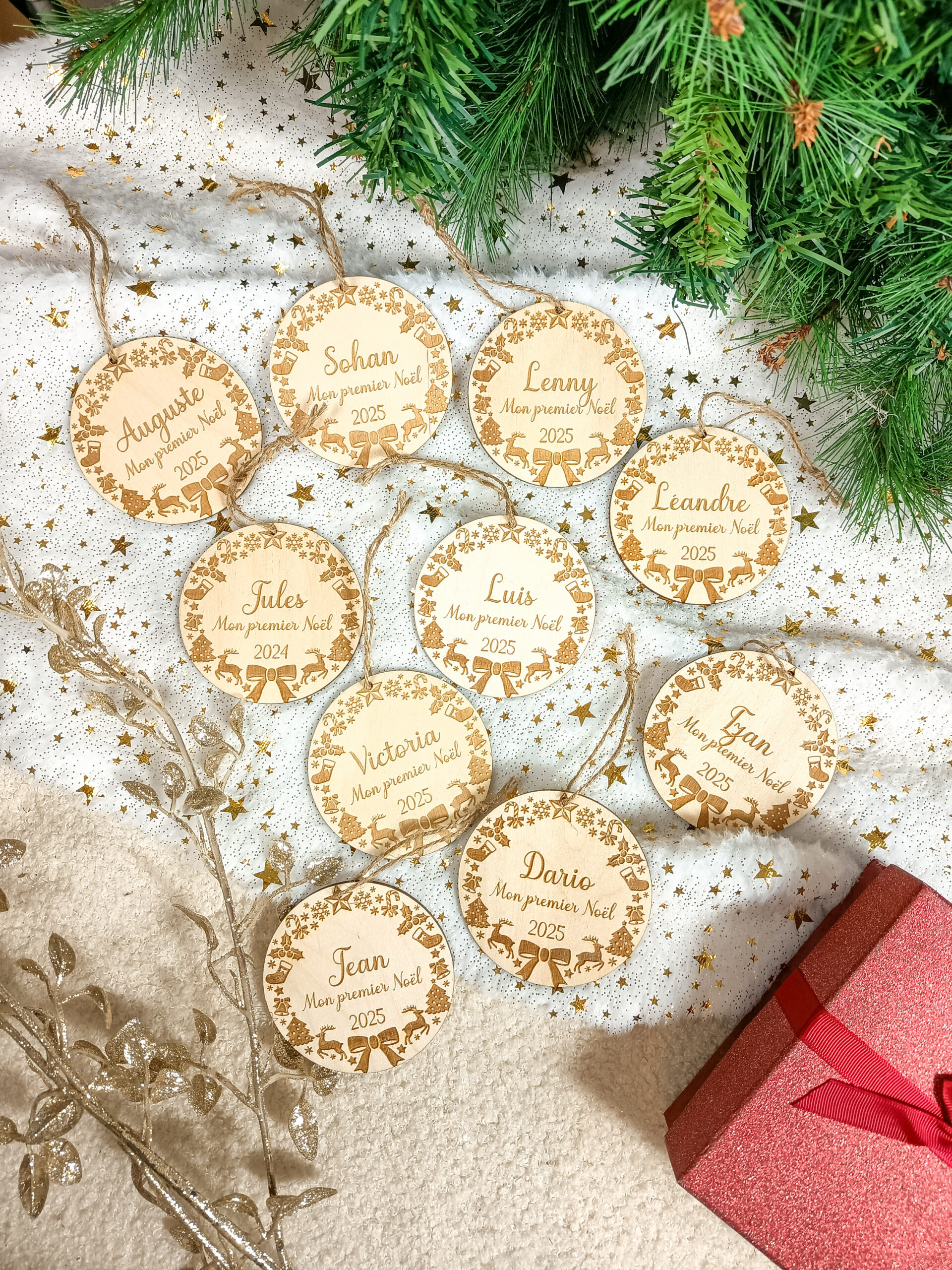 Indiquez le prénom, si vous souhaitez la mention “Mon premier Noel 2025” indiquez le avec le prénom de l’enfant.